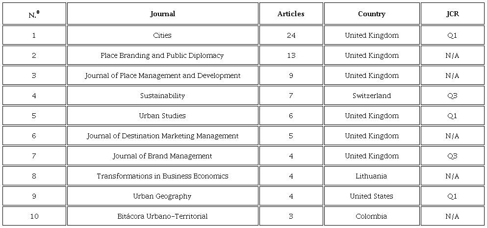 Table 1 shows the ten journals with the highest number of scientific articles published in the area of city marketing. It is interesting to note that six of them belong to the United Kingdom. Besides, one can observe that most of them are indexed in the category of emerging journals, which means that these journals have been increasing their rigor and recognition in recent years. It is also worth noting that one of them is a Colombian journal, with three articles published in the field of city marketing.