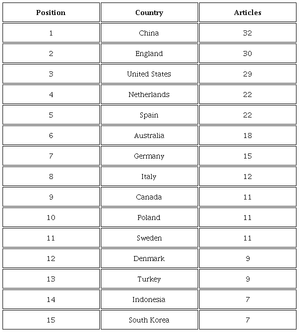 Table 2 shows the top 15 countries with the highest scientific production in the field of city marketing. China appears in first place with 32 academic articles published on this subject, followed closely by England and the United States with 30 and 29 articles, respectively. No Latin American country figures in the list, which demonstrates deficient production on the subject in this region.