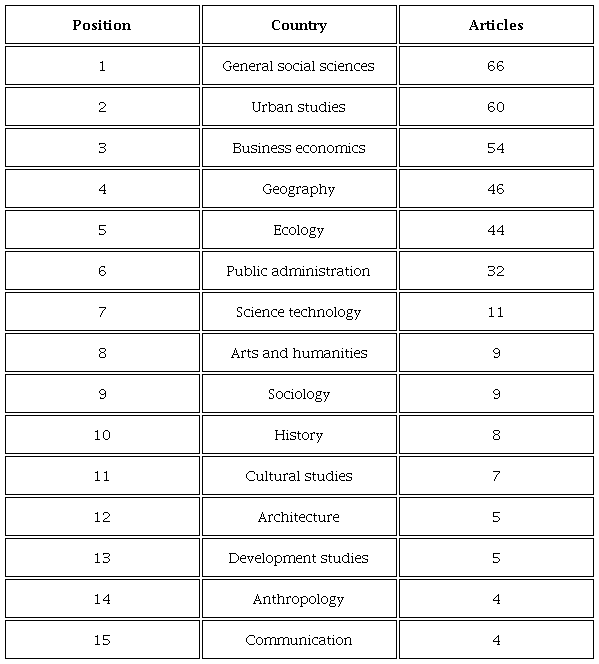 Social sciences is in the first place with 66 papers, followed by urban studies with 60 articles and, the area of economic business in third place with 54 manuscripts.