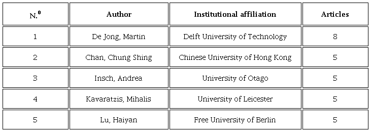 Table 4 is built according to the metrics of Web of Science, and it shows the authors with the largest number of published manuscripts in the field of city marketing. Martin De Jong, professor at Delft University of Technology, The Netherlands, tops the list with eight published articles. In his most referenced work -eight citations- De Jong conducts a case study to identify the city marketing practices applied by some Chinese cities in order to position themselves as ecological and economic hotspots (Lu, De Jong, & Chen, 2017).