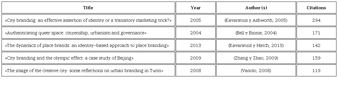The work of Kavaratzis and Ashworth (2005) appears in first place with 294 citations; and as mentioned in the previous section, not only it defines the concept of city marketing or city branding, but also proposes brand-product construction techniques that can be effectively applied in the construction of city identity.