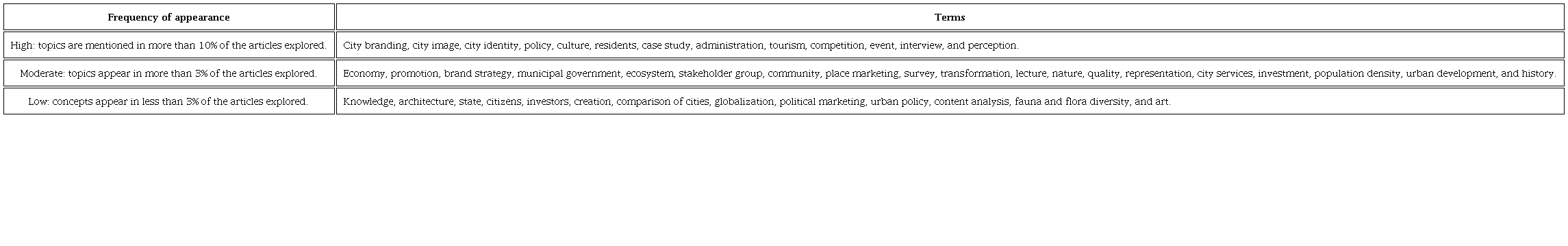 The term with the highest occurrence is City Branding with 123 appearances in the analyzed manuscripts. This term refers to the construction of a brand for a city, and it is the central process within the city marketing strategies; therefore, it is understandable that it appears in the first place. It constitutes the creation of brand identity for a specific place (Merrilees, Miller, & Herington, 2009).
