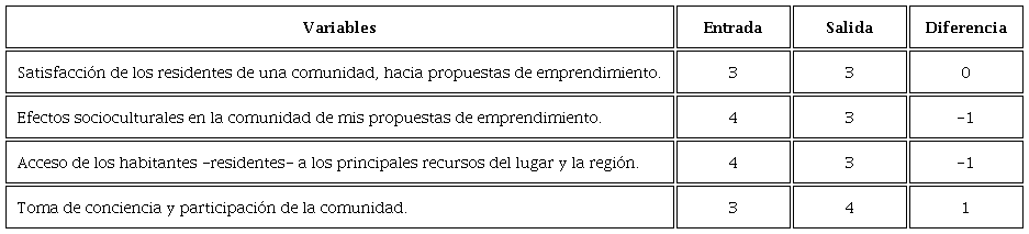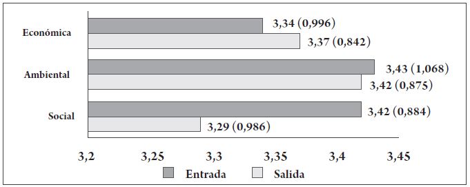 De las tres dimensiones que definen el emprendimiento sustentable, en la población observada se descubre mayor inclinación a tratar con más frecuencia las variables ambientales tanto en las repuestas de entrada -3,43- como en las de salida -3,42- del taller. Esto indica que es prácticamente inexistente el cambio. Le siguen los ítems de la dimensión social, con 3,42 para la entrada y 3,29 para la salida; se nota que el indicador disminuyó y, si bien inicialmente estaba en un nivel similar al de las variables ambientales, en la salida quedó con la puntuación menor.