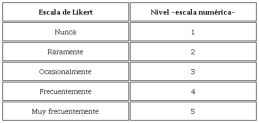 El tratamiento de los datos implicó la conversión de equivalencias de la escala de Likert ordinales a escalas numéricas también ordinales con el fin de analizar los cambios, teniendo en cuenta las frecuencias, sus proporciones y, especialmente, para el análisis de fiabilidad con el alfa de Cronbach. La conversión de los datos, en los cinco niveles en los cuales se obtienen respuestas, se realizó bajo el criterio descrito en la tabla 1.
