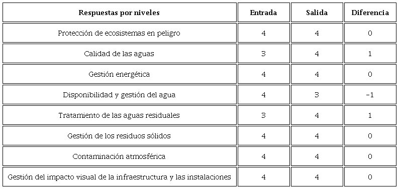 En la dimensión ambiental, solo en tres de las ocho variables se presentan cambios en las modas. Se ratifica lo observado en los promedios, de manera que esta es la dimensión con mayor arraigo cultural. Como hallazgo particular se tiene que los cambios se presentan solo en las variables relacionadas con el agua. Hay una importante reflexión sobre disponibilidad y uso del agua, de manera que es el único cambio negativo. Los cambios positivos reflejan la mayor internalización en los aspectos relacionados con la calidad de las aguas y el manejo de aguas residuales. También en esta dimensión las respuestas se concentran en las opciones «ocasionalmente» y «frecuentemente» (véase la Tabla 3).