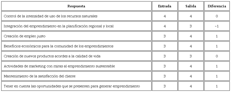 Los cambios de los promedios entre salida y entrada evidencian la reflexión de los asistentes sobre emprendimiento sustentable. La sensibilización lograda en el taller permite aproximarse a los cambios en las formas de pensar, decidir y actuar al tener en cuenta las tres dimensiones. Los resultados muestran que los asistentes dan mayor importancia, en su orden, a las variables ambientales, económicas y sociales. Las puntuaciones deben ser interpretadas cuidadosamente puesto que el taller implica el desarrollo de mayor sentido crítico-reflexivo y, por tanto, los asistentes al responder las preguntas en la salida del taller lo hacen con mayor prudencia.