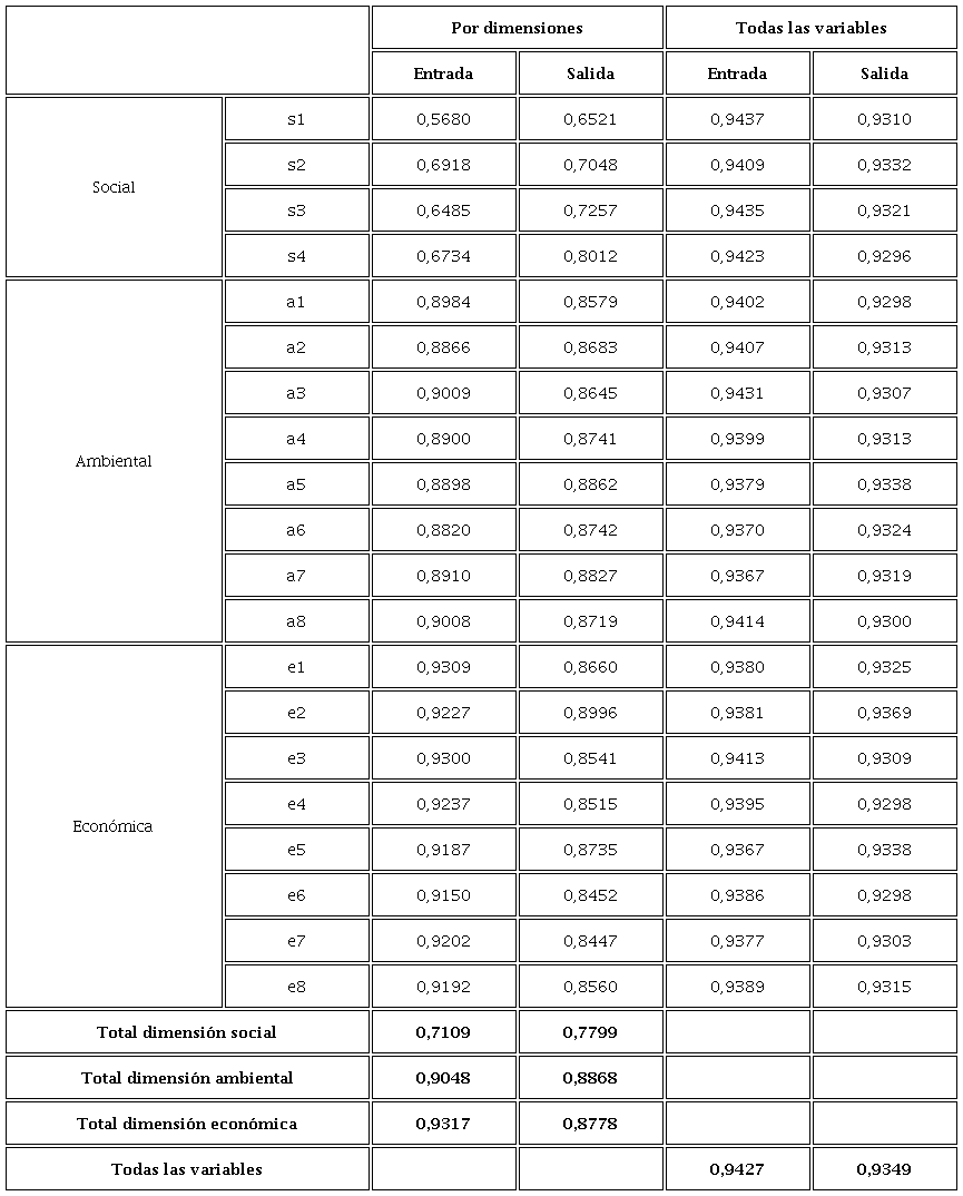 Al quitar alguna de las variables agrupadas, el estimador alpha de Cronbach del grupo disminuiría, situación que no es deseable. Por ejemplo, si en las mediciones de entrada se quitara la variable s1 de la dimensión social, el alpha de Cronbach de esa dimensión disminuiría a 0,56 y empeoraría la situación, pues al ser incluida tal variable con las otras tres el alpha es 0,71. Siguiendo este razonamiento, para el caso en cuestión es preciso afirmar que no conviene eliminar ninguna variable, ni a la entrada ni a la salida, pues en la inmensa mayoría de los casos el alpha caería, o, de acuerdo con los resultados, el beneficio en confiabilidad sería marginal y se perdería información.