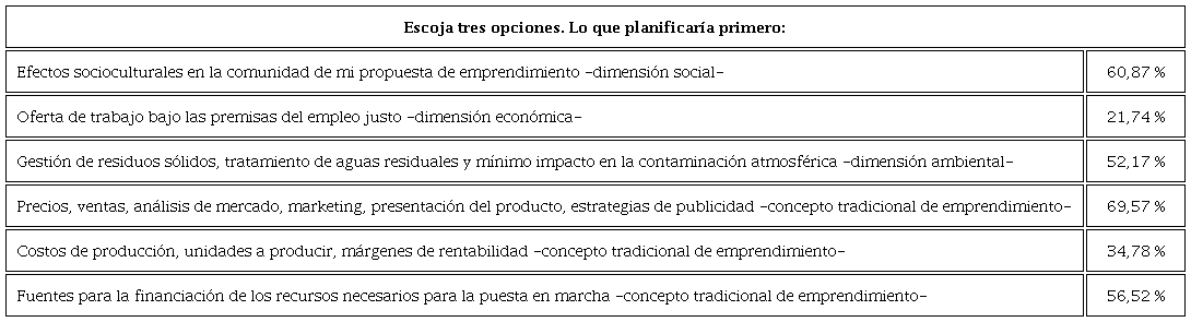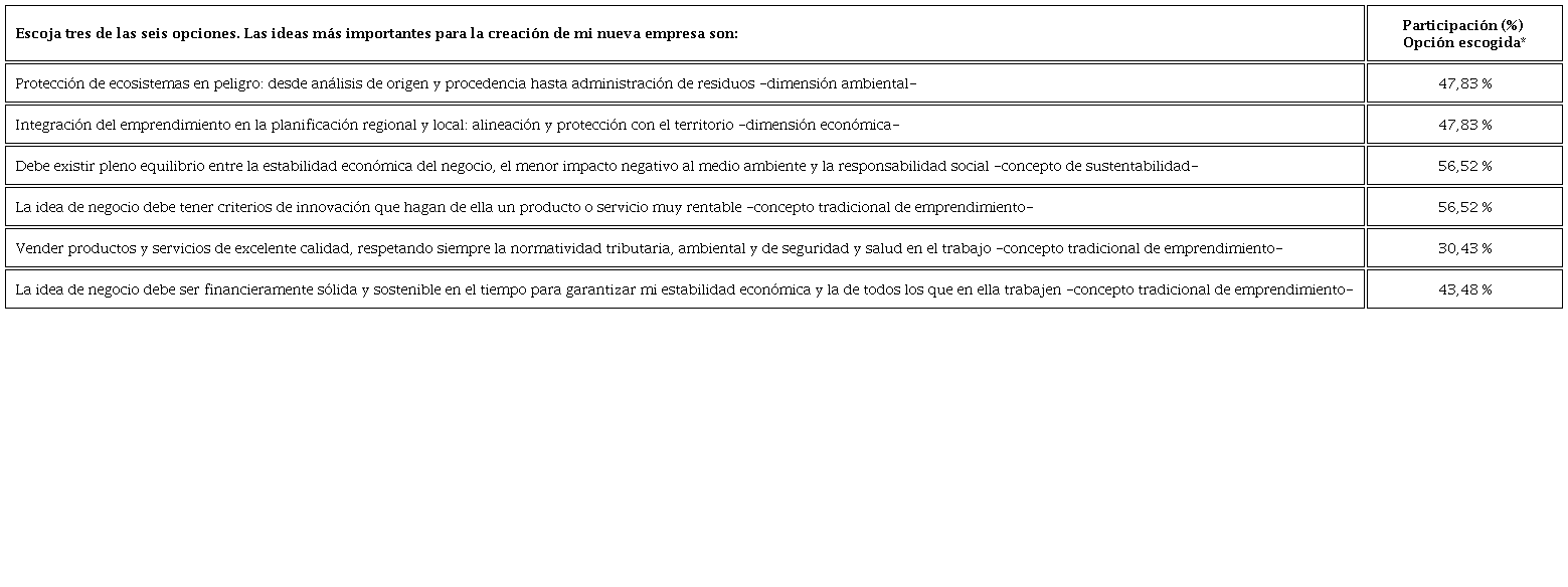 Se construyen tres preguntas en las cuales cada una tiene tres opciones de emprendimiento sustentable -correspondientes a variables incluidas en el cuestionario de entrada y salida- y tres opciones vinculadas más estrechamente a una visión de emprendimiento sin mayores consideraciones de sustentabilidad. Se formularon las preguntas indicando que se escojan solo tres opciones. Se considera que, al escogerse por lo menos una opción de las incluidas en el formulario de entrada y salida, ya se entendería que hay mayor apropiación cultural de la sustentabilidad en el individuo. Es preciso notar que todas las opciones son válidas y hacen referencia al emprendimiento. En las tablas 6, 7 y 8 se presentan los porcentajes de las opciones más escogidas por los asistentes al taller.
