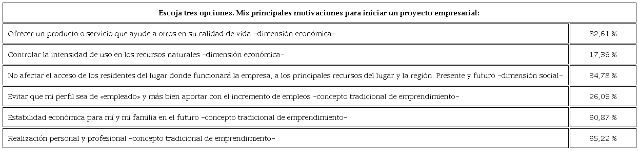 Respecto a las motivaciones que se tienen a la hora de crear empresa, la más escogida -82,61 %- hace parte de la dimensión económica de la sustentabilidad. Los análisis del emprendimiento se centraron en las motivaciones como necesidad de logro, inherentes al emprendedor nato. Esta respuesta apunta a perfilar los asistentes al taller como personas con iniciativa hacia la creación de empresa con apropiación de sustentabilidad (véase la Tabla 7).