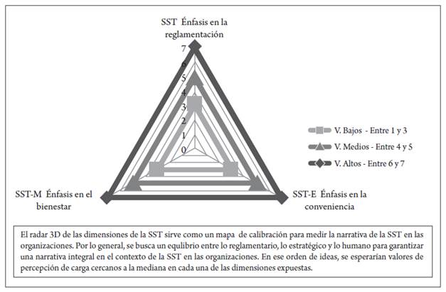 Cabe aclarar que, al hacer referencia a la SST, por lo general no existe una aproximación monolítica sobre estas dimensiones. Es decir que una autoridad, una organización, un gerente o un académico no necesariamente adopta una perspectiva única de la SST en sus análisis y decisiones. De hecho, la complementariedad de dichas dimensiones da lugar a una combinación de aproximaciones con diferentes dosis de cada una de las dimensiones propuestas. Para esto, se propone el uso de un radar 3D que ayuda a calibrar las intensidades respectivas en cuanto a lo reglamentario, lo estratégico y lo moral. Véase la figura 1.