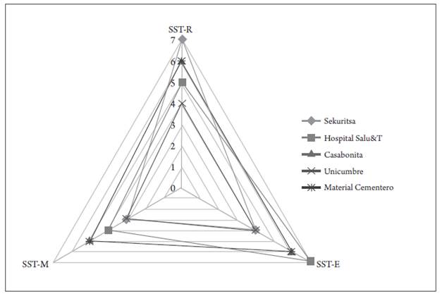 • Para el caso de la política de SST de Sekuritsa, existe una profundización marcada hacia el marco reglamentario, de manera que se dejan relegadas los dos marcos restantes: el estratégico, con una puntuación media-baja, y el moral, que resultó con una puntuación baja.