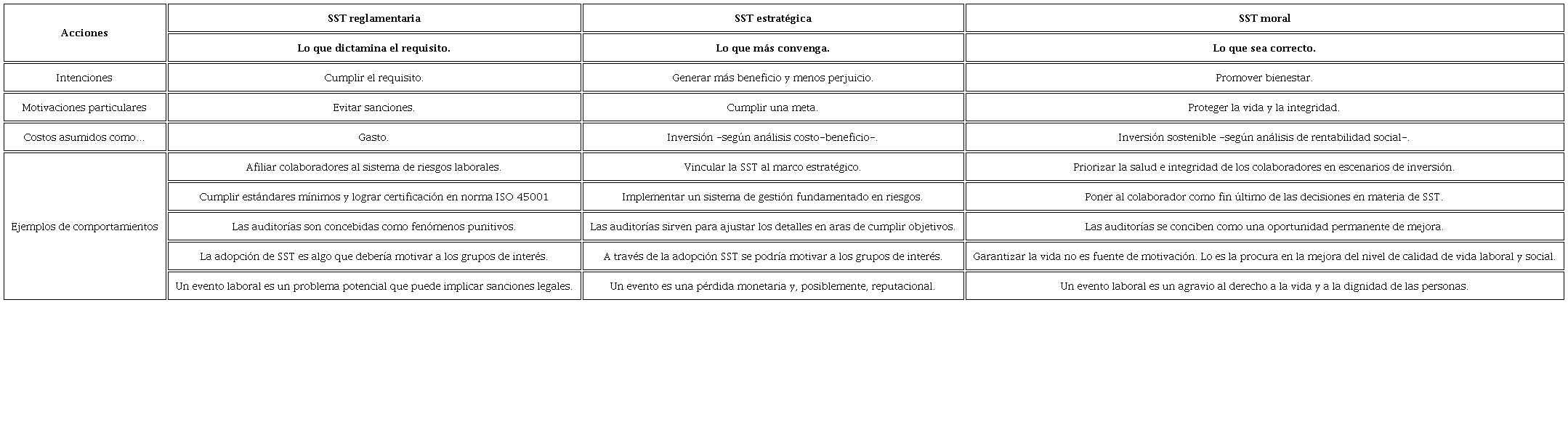 Es así como, siguiendo estos parámetros, se aprecia una variedad de enfoques con relación a la adopción de la SST. Estos enfoques pueden ir desde la definición del concepto como un elemento de escudo jurídico frente a la ilegalidad, hasta la defensa de la SST como una práctica que enaltece la protección de la vida y la dignidad humana por sobre todas las cosas. Adicionalmente, muchos de ellos incluyen o giran en torno a la irremediable necesidad de implementación de prácticas gerenciales de carácter sistémico en torno a la SST como mecanismo de soporte para el cumplimiento de metas.