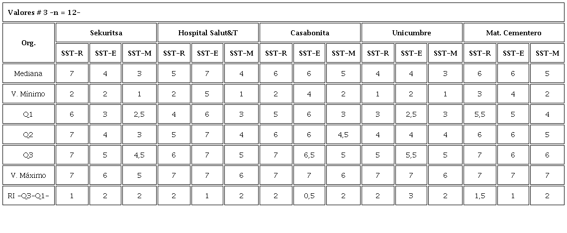 En primera instancia, al procesar los datos de cada una de las rondas aplicadas para cada organización, se presentan los resultados obtenidos en la ronda 3 (véase la Tabla 2), resaltando la baja dispersión obtenida en ella -dada por un RI < 2 en cada medición-, lo cual es indicativo de una relativa unificación de criterios. Las medianas de estos últimos resultados se trasladan gráficamente en el radar 3D presentado en la figura 2.