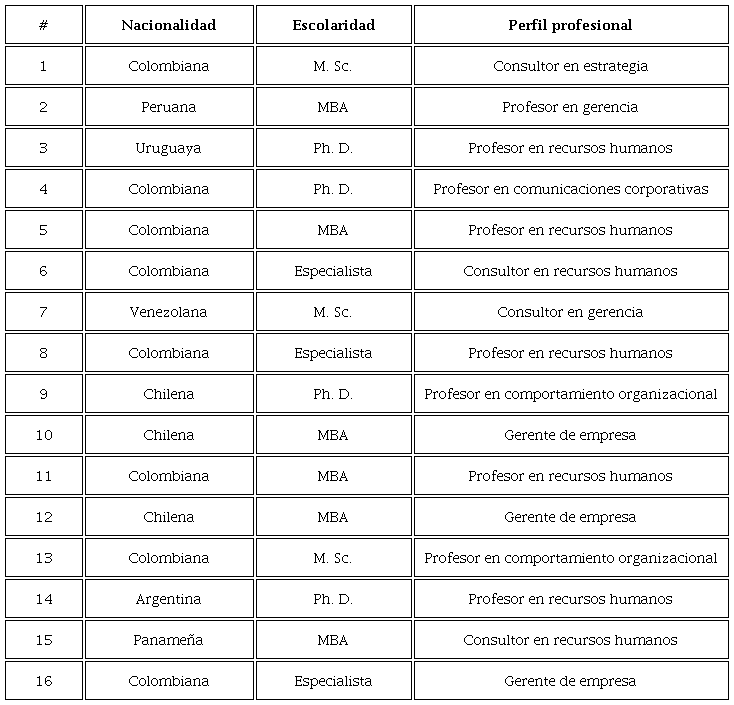 Con el fin de investigar sesgos, se decide que, en lugar de convocar profesionales de la SST, los diagnósticos se fundamenten en las percepciones de dieciséis expertos en gerencia y recursos humanos de origen latinoamericano (véase el Anexo 1) que son congregados a un estudio Delphi de tres rondas. La metodología Delphi consiste en recoger las opiniones de un panel de expertos en una temática particular que, de forma independiente y anónima, evalúan unos elementos planteados en aras de consolidar opiniones sobre un tópico específico (Iqbal y Pipon-Young, 2009). Por tratarse de un método interactivo, su uso invita a la unificación de criterios y construcción de consensos sobre temas relacionados con una problemática determinada. El estudio garantiza reserva y anonimato para sus participantes.