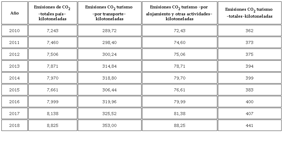 Considerando todos los medios de transporte utilizados por la industria turística, así como el alojamiento y otras actividades asociadas, la tabla 1 presenta la estimación de las emisiones del sector para el periodo 2010-2018.