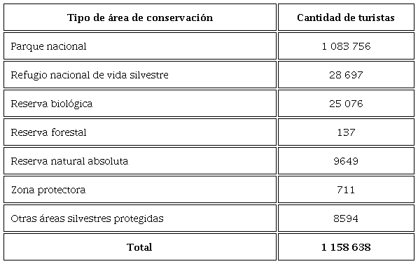 Se ha mencionado que la actividad turística en Costa Rica está estrechamente vinculada con las áreas de conservación existentes. El Minaet (2015) reporta que el 26 % de la superficie continental y el 3 % de la zona marina se encuentran bajo alguna forma de protección, entre las que se pueden mencionar parques nacionales, refugios de vida silvestre, reservas forestales y zonas protectoras, entre otras.