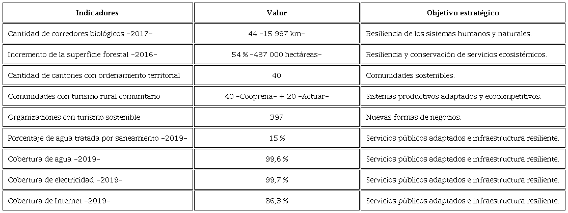Fomento de las condiciones para la resiliencia de los sistemas humanos y naturales mediante la planificación territorial, marina y costera. Para esto se requiere generar información a partir de sistemas de registro, el monitoreo, la previsión de factores climáticos e hidrológicos y sus impactos -servicios climáticos-, así como la capacidad de tomar decisiones en materia de adaptación (Minae y IMN, 2018, p. 61). Esto implica incluir criterios y lineamientos de adaptación al cambio climático en los instrumentos de planificación sectorial, regional y de ordenamiento territorial, marino y costero a distintas escalas.