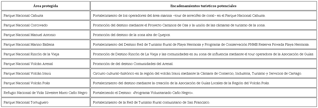 El Proyecto BID Parques identificó una importante cantidad de encadenamientos turísticos y redes de colaboración de entes públicos y comunidades, orientados todos al desarrollo del turismo sostenible. En la tabla 4 se presentan los detalles; se puede observar que las oportunidades pasan por las redes y las alianzas público-privadas, y las implicaciones que esto puede tener desde el punto de vista de nuevos negocios, nuevas formas de producir los servicios turísticos y nuevos mecanismos para la comercialización de servicios turísticos y otros. Ofreciendo así, además, oportunidades para la adaptación al cambio climático.