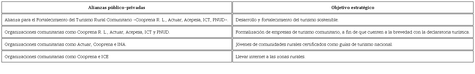 Como parte de las tareas que se realizan en las comunidades con miras a fortalecer el turismo aportando elementos para la competitividad, se han establecido diversas alianzas público-privadas (véase la Tabla 5). Interesa mucho destacar que estas alianzas permiten y favorecen la formalización de los emprendimientos, en especial en las zonas rurales, pero además contribuyen a la creación de nuevos mercados y diversifica la oferta turística. Así, por ejemplo, las comunidades rurales han apostado al desarrollo de sus territorios a partir de actividades turísticas particulares, entre las que se pueden mencionar: el turismo rural comunitario, el turismo sostenible y el agroturismo. En todas ellas se establece una interesante combinación de actividades productivas con ganadería, cultivos perenes, especialmente los tours de café o chocolate, mariposarios, pesca, agricultura orgánica y beneficios de café, entre muchos otros, con el objetivo de ofrecer al turista una experiencia adicional de disfrute y convivencia con los lugareños y con los espacios ambientales.