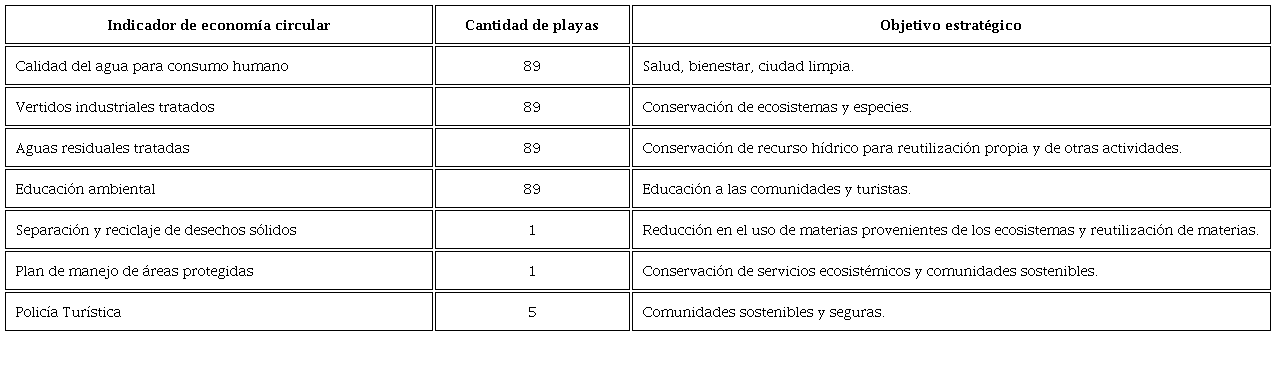 Este programa otorga distinciones en cinco niveles que se traducen en estrellas, determinados por una serie de lineamientos. En la tabla 6 se presentan algunos indicadores de economía circular calculados para espacios de playa a partir de los resultados del Programa Bandera Azul Ecológica7.