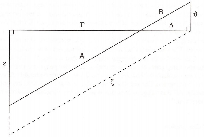 Justice in distributions can also be represented graphically, but that representation is much more complex. The simplest way of representing proportions is by means of similar triangles. In Keyser’s representation, below, one can assume, for example, that A represents the amount of social good awarded to a given individual, whereas ε represents his moral worth. If B is the amount of social good awarded to some other individual whose moral worth equals υ, the distribution will be fair, because, since the triangle AεΓ is similar to BυΔ, it follows that A/B = ε/υ (Figure 2).