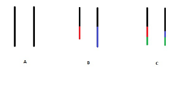 This can be expressed geometrically as well (Figure 1, below). The amount of good possessed by each part in the transaction may be represented as a black straight line. Both lines are initially equal (Figure 1. A.). If one line is longer than the other after the transaction, the transaction is unfair. In our example, we can assume that the transaction involved an exchange between the blue and red line segments, which are unequal, resulting in two different lines after the transaction (Figure 1. B.). It is the role of the judge in such situations to make the amounts equal again, dividing the straight line that became bigger and giving the excess to the smaller one (NE V 7 1132a 7-8)8. In our example, the judge must take half the difference between the blue and red lines, take it from the bigger line and attribute it to the smaller one. That difference is represented by the green lines.