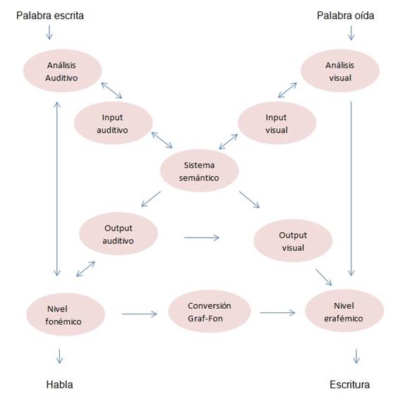 Así, muchas de las explicaciones de la psicología cognitiva se construyen a partir de un explanandum que hace referencia a la capacidad cognitiva de un determinado sistema de procesamiento (como la visión o el lenguaje, etc.) y un explanans que hace referencia a los sistemas de procesamiento de la información que hacen posible la capacidad cognitiva en cuestión. Por ejemplo, ¿cómo se explica la capacidad cognitiva de comprender una palabra presentada oralmente? Ellis y Young (1992) dan una explicación funcional como la mencionada. La capacidad de reconocer una palabra hablada se explica a partir de un modelo general de comprensión y producción léxica oral y escrita, lo cual se evidencia en esta Figura 1: