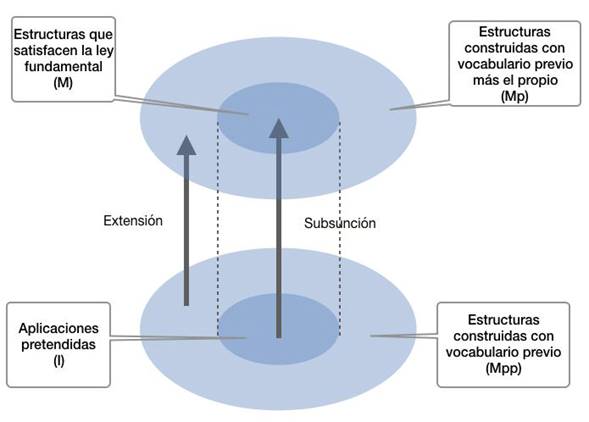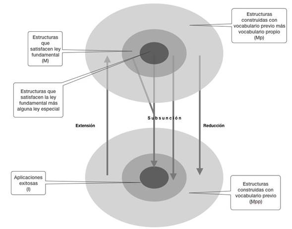 Pero dado que las teorías maduras son una red teórica, i.e., un conjunto de elementos teóricos ordenados parcialmente por relaciones de especialización, la subsunción modelo-teórica de los sistemas intencionales por parte de TI, no solo incluye la(s) ley(es fundamental(es) de TI (Fig. 1), sino también leyes especiales cuando está involucrado un pedazo de la red teórica. Estas leyes, especiales, junto con ligaduras [constraints] especiales y con los vínculos interteóricos especiales constituyen las constricciones especiales que los sistemas reales ampliados deben cumplir para ser modelos reales M(TI) (Ver Fig. 2).