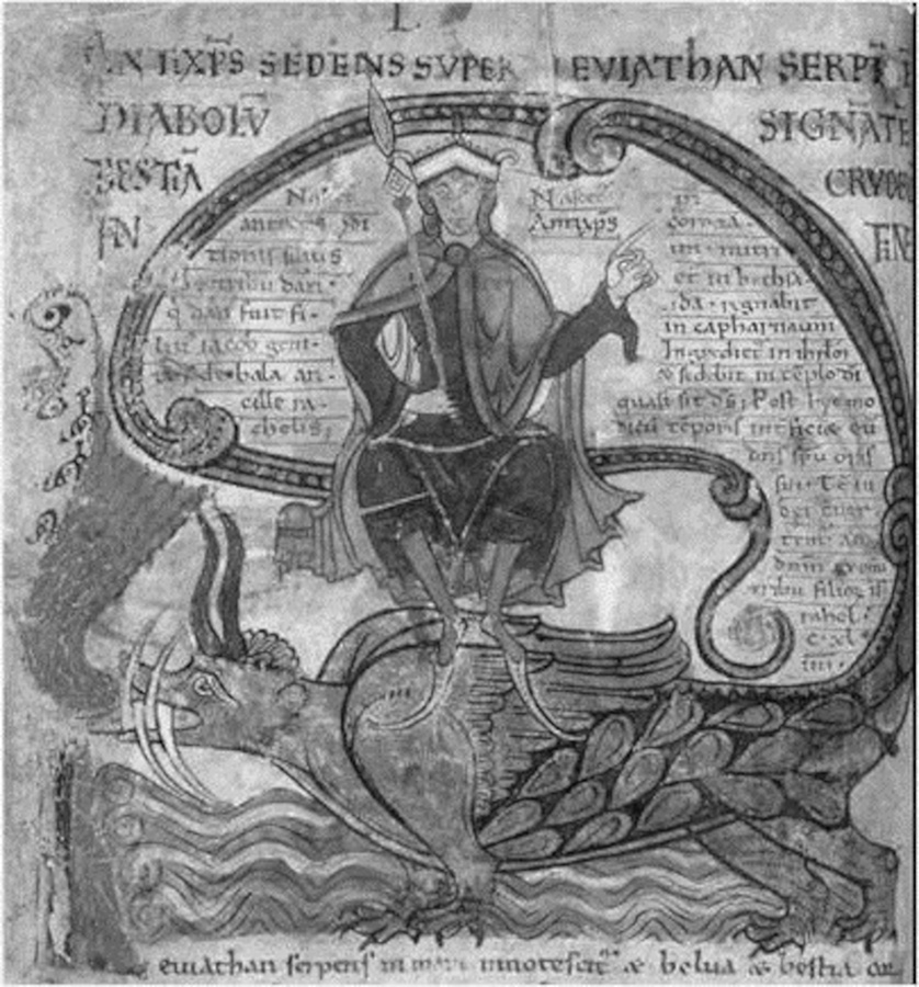 El Anticristo, con una corona regia en la cabeza, mantiene en la mano derecha una lanza (como el Leviatán de Hobbes una espada), mientras que la mano izquierda realiza el gesto de la bendición (que corresponde de algún modo como símbolo del poder espiritual al báculo del frontispicio). Sus pies tocan el dorso del Leviatán, representado como un dragón de cola larga parcialmente inmerso en el agua. Arriba, la inscripción subraya el significado escatológico tanto del Anticristo como del monstruo: El anticristo sentándose por sobre Leviathan quien señala una serpiente diablo, cruel bestia hacia el final (Agamben, 2017, pp. 64-66).