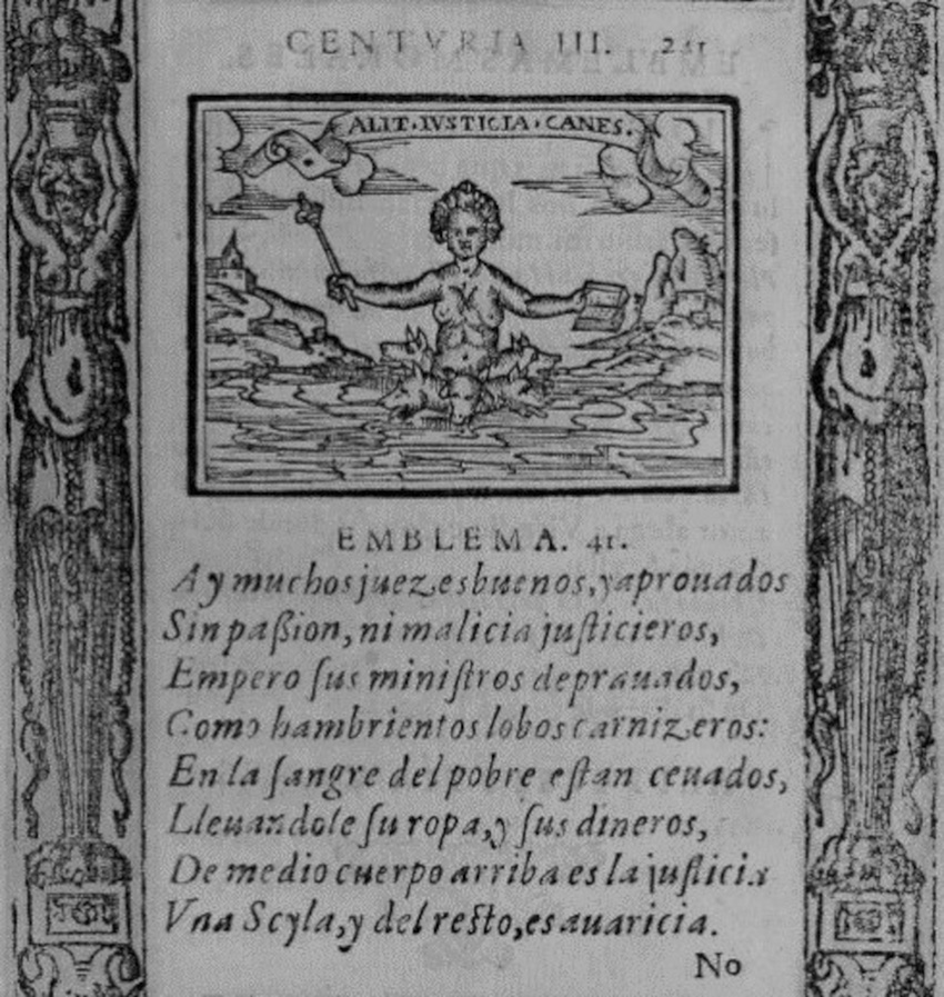 La hidra de Sebastián de Covarrubias sería análoga a la multitud hobbesiana. Un cuerpo monstruoso compuesto por sujetos guiados por juicios propios y apetitos particulares -sin contar la insistencia, en ambas propuestas, sobre el problema de las juntas, los cabildos y la imposibilidad de formar un juicio o voluntad unitarias-. De esta forma, aquella figura hídrica y serpentina se desplaza, en términos iconográficos, a la figura de aquellos que ostentan el gobierno del poder soberano (Figura 5). Un gobierno representado con el cuerpo femenino de una Escila, y cuyas partes inferiores son compuestas por perros, en este caso, la disposición del cuerpo en el emblema suscita la imagen del cuerpo soberano del Leviatán. Parte de los versos del emblema indican, “Ay muchos juezes buenos, y aprovados/Sin pasión, ni malicia justicieros /empero sus ministros depravados, Como hambrientos lobos carnizeros (Sic)”. De lo cual se deriva que la imagen de aquel que gobierna se compone de una naturaleza dual: “De medio cuerpo arriba es la justicia/ una Scyla, y del resto, es avaricia” (de Covarrubias Orozco, 1610, centuria III, emblema 41, sin paginación). En este caso, la convergencia entre de Covarrubias y Hobbes se da en la imagen, pues surge una insólita relación entre el cuerpo de la Scyla (Figura 5) y la imagen del soberano en el frontispicio (Figura 1). Aunque, por otro lado, se declara que la parte inferior del cuerpo -aquella que esta oculta en el frontispicio- representa la avaricia y la corrupción del cuerpo político (i.e. facciones o alianzas).
