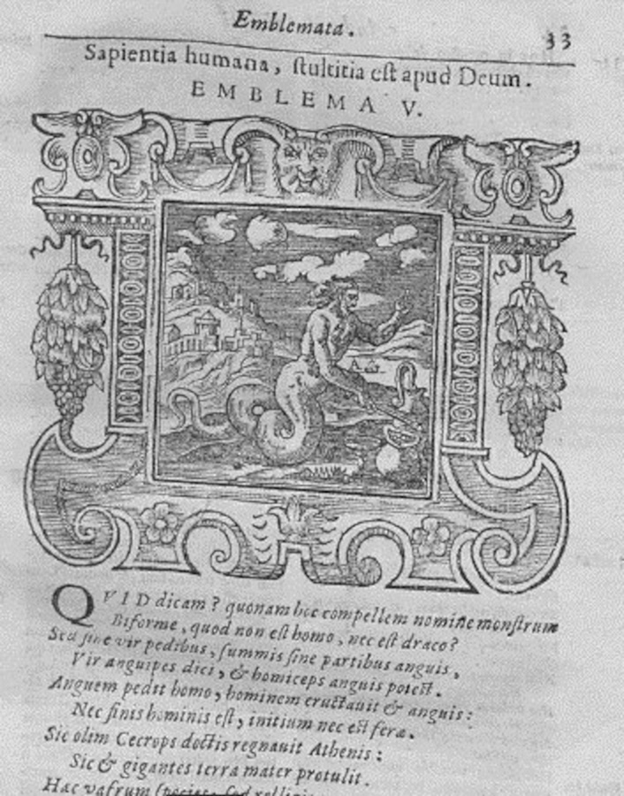 Ahora bien, la lectura que propongo, sin desmeritar el valor de las anteriores interpretaciones, se establece en línea con la elocuencia visual (i.e. la inspiración de la función retórica de los emblematas para la exposición de un concepto político) y con la relevancia del régimen democrático en la generación del cuerpo político al interior de la teoría hobbesiana. En primer lugar, señalo que, en efecto, puede demostrarse la ausencia de un cuerpo monstruoso que se hace explícita en la imagen soberana, en concordancia con el juego de presencia/ausencia propio de la repraesentatio. La pregunta es qué tipo de monstrum le interesa a Hobbes y cuál sería su relación con el soberano. Propongo entender la imagen monstruosa como la actualización y mixtión icónica de los emblemas de Sebastián de Covarruvias (Figura 5) y de Andrea Alciato (Figura 6). Tal mixtión sería un desplazamiento proteico: un monstruo biforme que denota el carácter conflictivo de las pasiones de la multitud y de las facciones (i.e. confoederatio). Entendido de esta forma, el soberano no sería más que aquella bestia biforme que, gracias a la convergencia de múltiples cuerpos, lograría ejercer el poder y el gobierno. En segundo lugar, busco demostrar, en el siguiente apartado, que esta lógica de la presencia/ausencia de la imagen monstruosa de un cuerpo multitudinario, y en especial el régimen democrático, son fundamentales para pensar la teoría política en Hobbes.