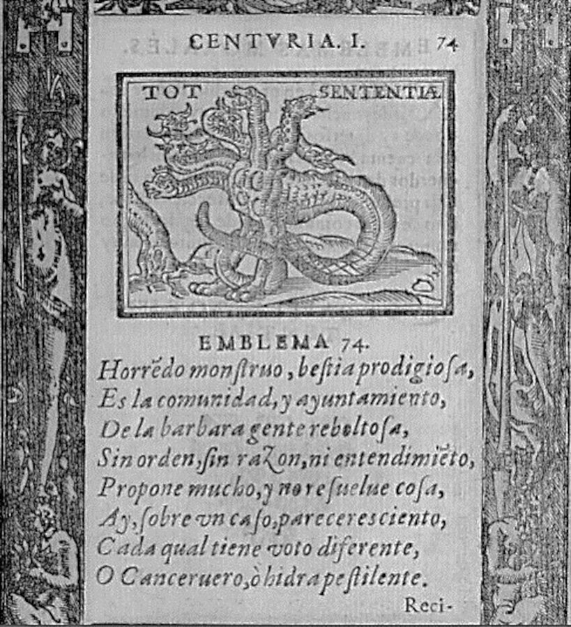 Como señala Skinner (2010, p. 26), está comprobado que Hobbes tuvo acceso a libros de emblemas, de amplia difusión entre mediados del siglo XVI y XVII, tales como los Emblemas morales (1610) de Sebastián de Covarrubias (Figura 7). Obra en la que, precisamente, se enuncia el problema político de las facciones -i.e. ayuntamieto (sic), las juntas de sabios y los cabildos ecclesiásticos (sic)- las cuales no hacen sino conformar un monstruo de múltiples cabezas, “Horredo monstruo, bestia prodigiosa, / es la comunidad, y ayuntamiento, / de la barbara gente reboltosa, / sin orden, sin razón, ni entendimiento (sic)” (de Covarrubias Orozco, 1610, Descripción emblema 74, sin paginación). El problema político de las facciones que interesa a Hobbes también se manifiesta en la multiplicidad opiniones con respecto a un summum bonum, pues de diversas opiniones se genera un sinfín de juicios. Aspecto también expresado en la cita del emblema “tot sententiae”, el cual hace referencia al locus latino “quot capita, tot sensus, quot homines, tot sententiae” [a cuantas cabezas, tantos discernimientos; a cuantos hombres, tantos juicios]. La proliferación de juicios -propiciada por grupos eclesiásticos o por facciones republicanas o de cualquier índole (L. X, pp. 82-93)- no es otra que la imagen de la multitud representada por una hidra (Figura 7) o serpiente de muchas cabezas.