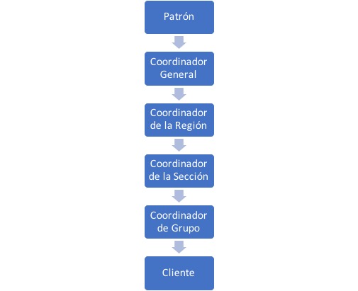 La red clientelar está estructurada jerárquicamente: en la parte más alta de la estructura se encuentra el patrón de la red, le sigue el coordinador general, el coordinador de región, el coordinador de sección, la coordinadora de grupo y, finalmente, el cliente: