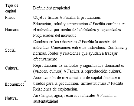 Aldridge et al. (2002: 13) señalan que el capital puede tomar en total seis formas: el capital físico incluye plantas, maquinaria y otros recursos; el capital natural, aire limpio, el agua y otros recursos naturales; el capital humano que contiene conocimientos, habilidades y competencias; el capital cultural incluye la familiaridad con la cultura de la sociedad y la habilidad de entender y usar el lenguaje; el capital financiero que se utiliza para consolidar, adquirir o invertir en otras formas de capital, y del capital social, al cual los autores no aportan definición.