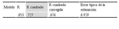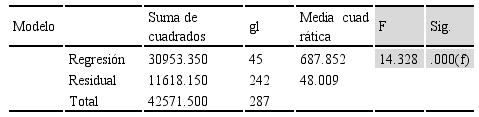Siguiendo con el análisis, de acuerdo con los resultados obtenidos en este modelo de regresión, respecto al análisis de la varianza (anova), el cuadro 4 muestra que el valor F (14.328) confirma que hay relación lineal significativa entre la variable dependiente (rendimiento en matemáticas) y las variables independientes (cuadro 5). Asimismo, indica que hay colinealidad entre las variables predictoras. Hay significancia entre dichas variables (.000); lo que viene a confirmar en primera instancia dicha relación lineal.