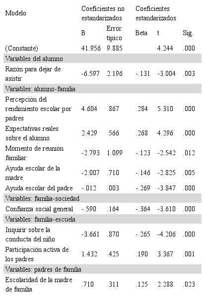 Resumen: Este texto da a conocer cuál es el efecto del capital social familiar sobre el rendimiento escolar en el área de matemáticas del alumno de sexto grado de educación primaria en contextos de pobreza en la ciudad de Saltillo, México. Fue un estudio cuantitativo, de tipo transversal, correlacional. Los resultados expuestos derivan del análisis de la aplicación de modelos de regresión lineal. El tamaño de la muestra utilizada fue n=192. La investigación se realizó en la zona escolar número 157, de la ciudad de Saltillo. El trabajo de campo se llevó a cabo entre los meses de noviembre de 2014 y enero de 2015. La matriz de correlaciones permite establecer cinco conclusiones generales a partir del grupo de variables que predicen el bajo rendimiento escolar en matemáticas. Alumno. Ausentismo del alumno. Alumno-Familia. Percepción del rendimiento escolar por parte de los padres, generar expectativas reales sobre el alumno, momentos de reunión familiar, ayuda escolar de ambos padres para hacer tareas. Familia-Sociedad. Confianza social. Familia-Escuela. Inquirir sobre la conducta del niño y la participación de los padres en actividades escolares. Capitales Culturales. Escolaridad de la madre de familia. Los hallazgos amplían la literatura existente que explica las causas del bajo rendimiento escolar. Coinciden con los hallazgos reportados en otras investigaciones realizadas en Chile, México (Puebla y Monterrey) y los Estados Unidos. Habilitan futuras investigaciones que puedan revisar otros contextos sociales u otros niveles escolares y generar estudios comparativos que posibiliten el sustento de una hipótesis general sobre el rendimiento escolar en matemáticas y su relación con el capital social en estudiantes de primaria en contextos urbanos.