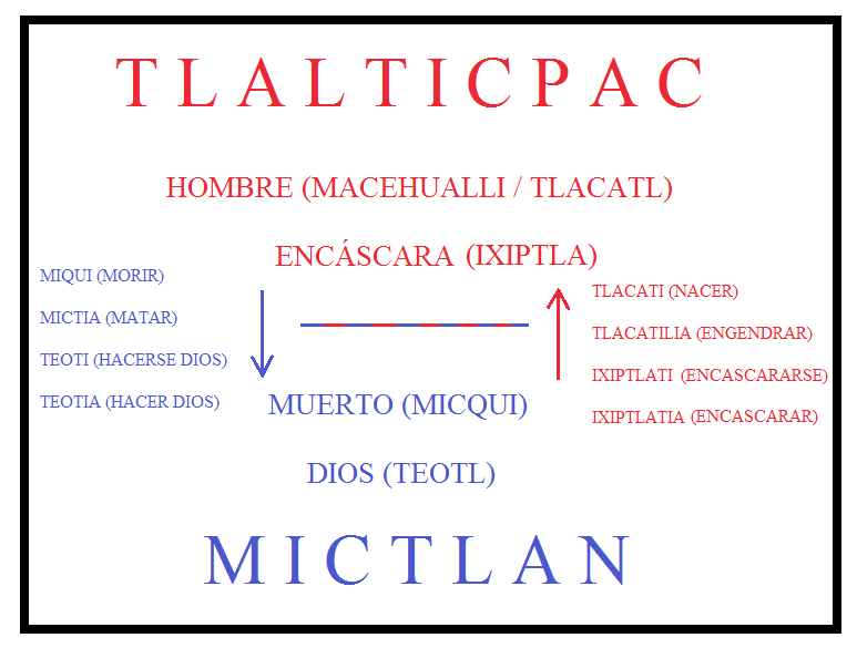 Los lugares de la muerte y las moradas de los dioses pueden ser considerados esencialmente equivalentes, dado que en ellos convivían dioses y muertos. Además, el mictlan no sólo era un lugar específico al que iban los muertos comunes, sino también un lugar genérico que incluía el tlalocan (“el interior de la tierra”) y el ilhuicac (“el cielo”), al que llegaban tanto los muertos de la tierra, como los muertos del sol (Garza Gálvez, 2015, 2018). Con este sentido general encontramos algunas expresiones en náhuatl, como el difrasismo in mictlan in topan (“el lugar de la muerte”, “el lugar arriba de nosotros”), que asocia el mictlan con la parte superior del cosmos (Montes de Oca Vega, 2013; Mikulska, 2015). El cielo diurno era uno de los lugares de la muerte, puesto que allí iban los fallecidos en las guerras, las mujeres muertas por parto y los cautivos sacrificados que formaban el cortejo del sol. Lo mismo podemos decir del cielo nocturno, dado que también las estrellas eran almas de guerreros muertos en la guerra (Seler, 1996). Por lo tanto, podemos concluir que el mictlan, entendido como lugar genérico de la muerte y morada de los dioses, se oponía estructuralmente al tlalticpac (“superficie de la tierra”), que era el lugar central, entre el cielo y el inframundo, reservado a los hombres y en el cual trascurrían sus vidas (Burkhart, 1989).