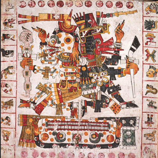 Desde luego, esta manera de sistematizar las transformaciones ontológicas nahuas obedece a nuestra predilección moderna por los cuadros, las tablas y los gráficos. Los antiguos nahuas lo expresaban de manera mucho más concreta y elegante a través de relatos y pinturas. En la famosa historia sobre la creación de los hombres, Quetzalcóatl roba los huesos de los muertos a Mictlanteuctli, los muele como semillas de maíz, los rocía con la sangre de su pene y crea el cuerpo (tonacayo) del cual fuimos hechos los seres humanos (Tena, Histoire, pp. 148-149; Tena, Leyenda, pp. 176-181). Una imagen muy conocida del Códice Borgia, en la que se opone a Quetzalcóatl (dios generador de vida) con Mictlanteuctli (dios generador de muerte), condensa de manera extremadamente clara y estética las profundas implicaciones ontológicas de la dualidad vida/muerte en Mesoamérica (figura 2).