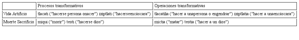 Dividimos el espacio de nuestro modelo con una línea divisoria en el medio: arriba situamos el espacio-tiempo del tlalticpac (“superficie de la tierra”), donde viven los hombres (macehualli o tlacatl); abajo colocamos el mictlan (“lugar de la muerte”), morada de los muertos (micqui) y de los dioses (teotl). Hombres y “encáscaras” mueren o son matados para transformarse en muertos o deidades; en una operación contraria, los dioses nacen o son engendrados, es decir, “se hacen encáscaras” (ixiptlati) o “son hechos encáscaras” (ixiptlatia), para transformarse en personas con un cuerpo que viven y actúan por un tiempo en el tlalticpac. En este esquema, podemos apreciar las diversas posibilidades de trasformación entre hombres y dioses, así como de tránsito entre la vida y la muerte, es decir, entre el tlaticpac y el mictlan.26 Podemos intentar simplificar los complejos procesos y las delicadas operaciones de trasformación ontológica a través de una tabla: