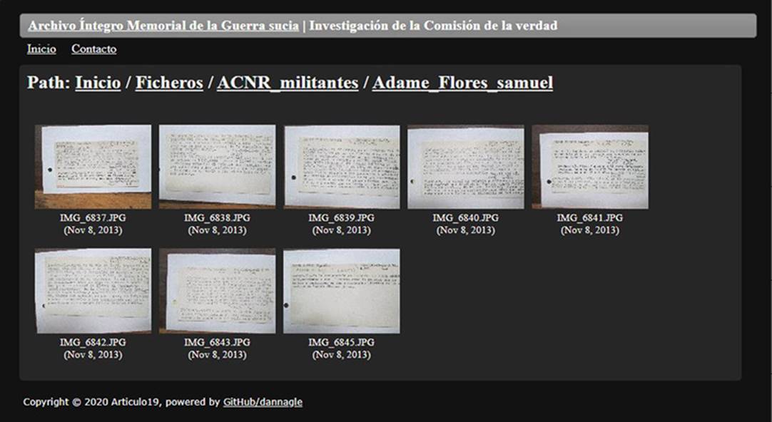 La siguiente sección corresponde a “La biblioteca”; ésta “contiene los archivos catalogados. Aquí podrá consultar la información relativa a las personas, servidoras/es públicas/os y organizaciones mencionadas en los archivos” (Article 19). Esta sección es el centro del trabajo de catalogación y descripción documental que realiza el equipo del archivo digital. A diferencia del mencionado Archivo Íntegro de la Comverdad, en la biblioteca se revisa cada uno de los documentos y, con una metodología diseñada previamente, se describe su contenido. A casi dos años de haber publicado el sitio web, se han catalogado 7 500 fotografías de las 310 000 que integran la totalidad del archivo. Estos números se pueden consultar en la sección dedicada a la numeralia; en ella se explica también que, en los documentos catalogados, se han mencionado a más de 106 000 personas, 1 853 organizaciones y 1 829 servidores públicos.