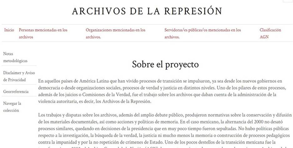 un portal no solamente digital sino también narrativo, esto es, nos da la posibilidad de dislocar las versiones hegemónicas tanto oficiales como de oposición y así trazar otras grafías desde las cuales remover el sedimento de un pasado que insiste ser presente. Un territorio que de tan secreto fue por mucho tiempo opacado tanto por el saber policiaco, jurídico e histórico, es decir, era patrimonio de la nación. (Artículo 19, 2018)
