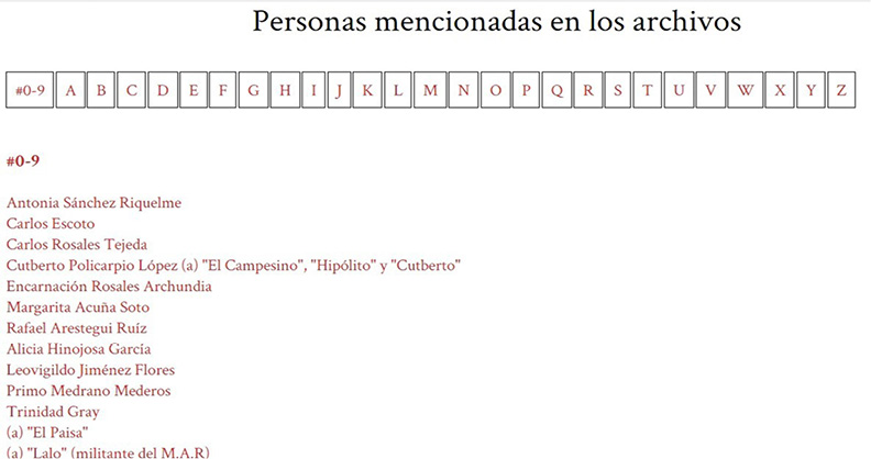 Varios de estos metadatos son compartidos por la mayoría de los archivos, como es el caso del AGN. Sin embargo, en Archivos de la Represión, la apuesta central en el diseño de metadatos gira en torno a los nombres de los ciudadanos mencionados en los documentos. Esto se puede observar en el diseño del archivo digital: una de las pestañas iniciales corresponde a ese metadato (Imagen 4). Ésta es una acción consciente y dirigida por parte del equipo de trabajo: “Teníamos muy claro la descripción, pero teníamos muy claro la necesidad de poner los nombres, entonces pusimos mucho énfasis en la catalogación de nombres de personas mencionadas en el archivo” (Jessica Alcázar. Comunicación personal, 20 de enero de 2020).