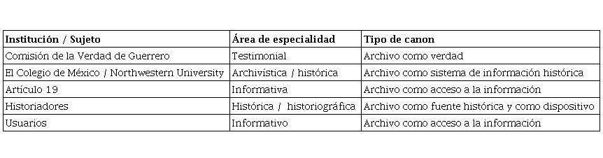 Para el caso de Archivos de la Represión, se describe el proceso de institucionalización a partir del análisis de Artículo 19, la Comverdad y el Colmex como instituciones especializadas en el conocimiento informativo, testimonial e histórico; característica que permite plantear la constitución de un canon archivístico.