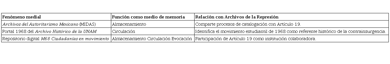 Para operar la categoría de los marcos mediales en el caso de Archivos de la Represión, se revisarán a continuación los productos mediales realizados bajo la nominación de archivo, biblioteca o repositorio digital que, de manera directa o indirecta, se acercan a la temática de la represión en México durante las décadas de 1960 a 1980. La selección corresponde a la relación que los mismos medios o instituciones han establecido con el proyecto. El objetivo final es dar a conocer las principales características comunicacionales del escenario medial sobre el periodo de contrainsurgencia en México.