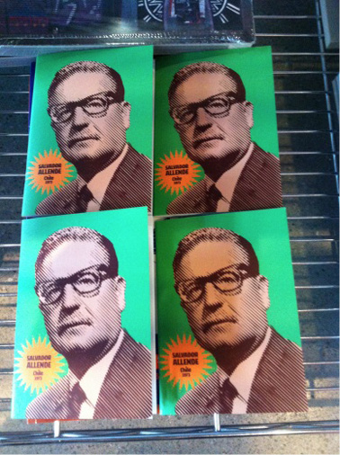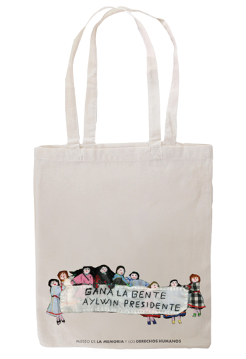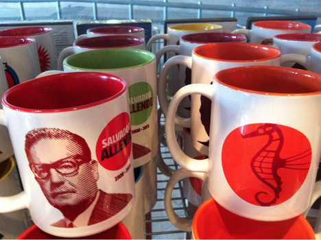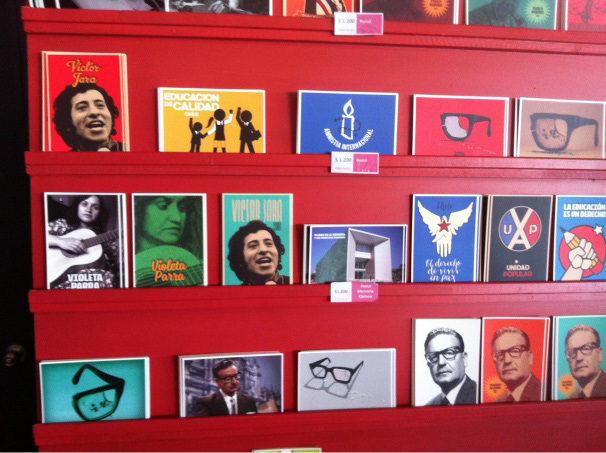 Se contemplaba que el Museo, inaugurado en enero de 2010, contara con un espacio para la venta de recuerdos en su último piso, al cierre de la muestra museográfica. Sin embargo, luego de su reapertura, tras el terremoto en febrero de ese año, el espacio comercial —con el nombre de Tienda Museo— fue trasladado al costado del edificio, frente al mural de Jorge Tacla. La tienda forma parte de una concesionaria privada con presencia en otros museos de Santiago;2 hasta agosto de 2015,3 vendía un sinnúmero de objetos serializados de distinto formato: tazones, chapas, pósteres, poleras, postales, magnetos, entre otros suvenires. En conjunto, estos objetos movilizaban distintas iconografías y estéticas vinculadas, en mayor medida, a la Unidad Popular y la lucha por los derechos humanos durante la dictadura.
