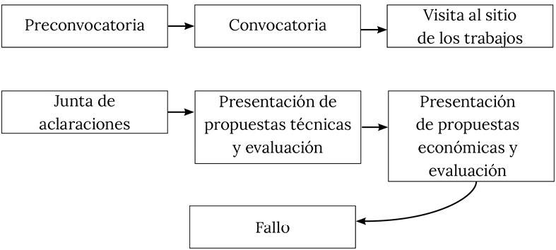 Estos procesos pueden ser nacionales o internacionales, con la ayuda de tratados internacionales o sin su ayuda (Correa, 2002, pp. 94-95). A su vez, la forma del proceso —cómo se entrega la información del competidor, es decir, la propuesta técnica y económica— puede ser electrónica, presencial o mixta. Además, existen otros elementos que complementan un proceso de compra trasparente, como la oferta subsecuente de descuento, que es propiamente una subasta; entre las subastas, la plataforma CompraNet está diseñada para ejecutar las siguientes modalidades: holandesa, inglesa, tedo y japonesa (Secretaría de la Función Pública, s. f., pp. 273-283). Las etapas que comprende el proceso de licitación pueden verse en la Figura 1.