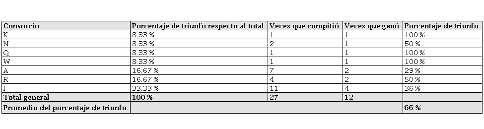 La tabla 9 muestra el porcentaje de triunfo de cada consorcio respecto al total de los proyectos, los consorcios líderes, las veces que compitieron, las veces que ganaron, el porcentaje de triunfo por consorcio y el promedio de triunfo.
