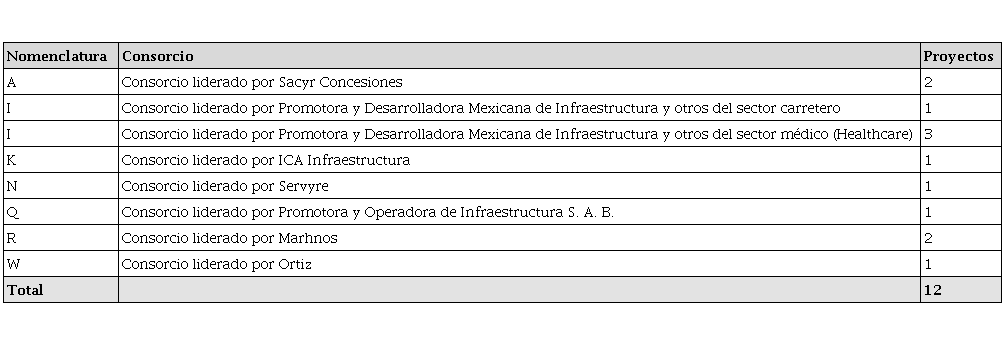 Ahora bien, debemos hacer la siguiente acotación: el consorcio identificado con la letra I, liderado por la empresa Promotora y Operadora de Infraestructura, realizó dos tipos de alianza: una para el sector médico y otra para el sector carretero. Desglosando las alianzas del competidor I, el resultado final sería el de la tabla 10, en donde se muestra el nombre completo de los consorcios ganadores por cantidad de proyectos adjudicados.