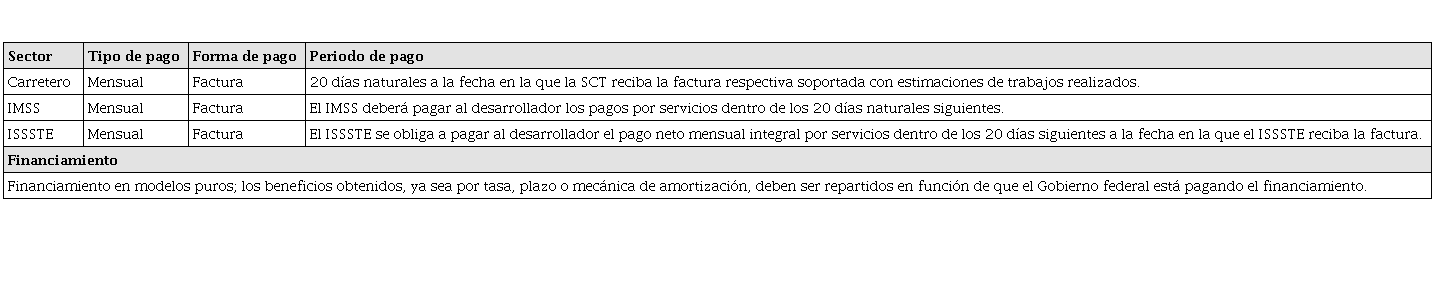 Forma de pago: la modalidad pura implica que los pagos por los bienes y servicios públicos provienen en su totalidad de recursos públicos del Gobierno federal; en el modelo autofinanciado, los pagos por bienes y servicios son suministrados por el desarrollador privado mediante el pago de cuotas y servicios.
