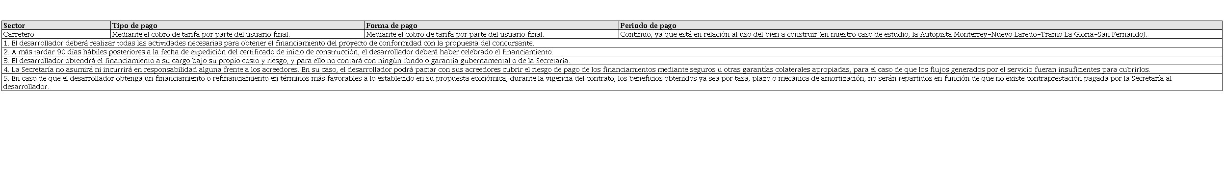 El único proyecto con modelo autofinanciado fue la Autopista Monterrey-Nuevo Laredo-Tramo La Gloria-San Fernando; en este caso, los pagos por bienes y servicios son suministrados por el desarrollador privado mediante el cobro de tarifas, recursos de particulares o ingresos generados por dicho proyecto (Cámara de Diputados del H. Congreso de la Unión, 2017, art. 3, frac. IIIc).